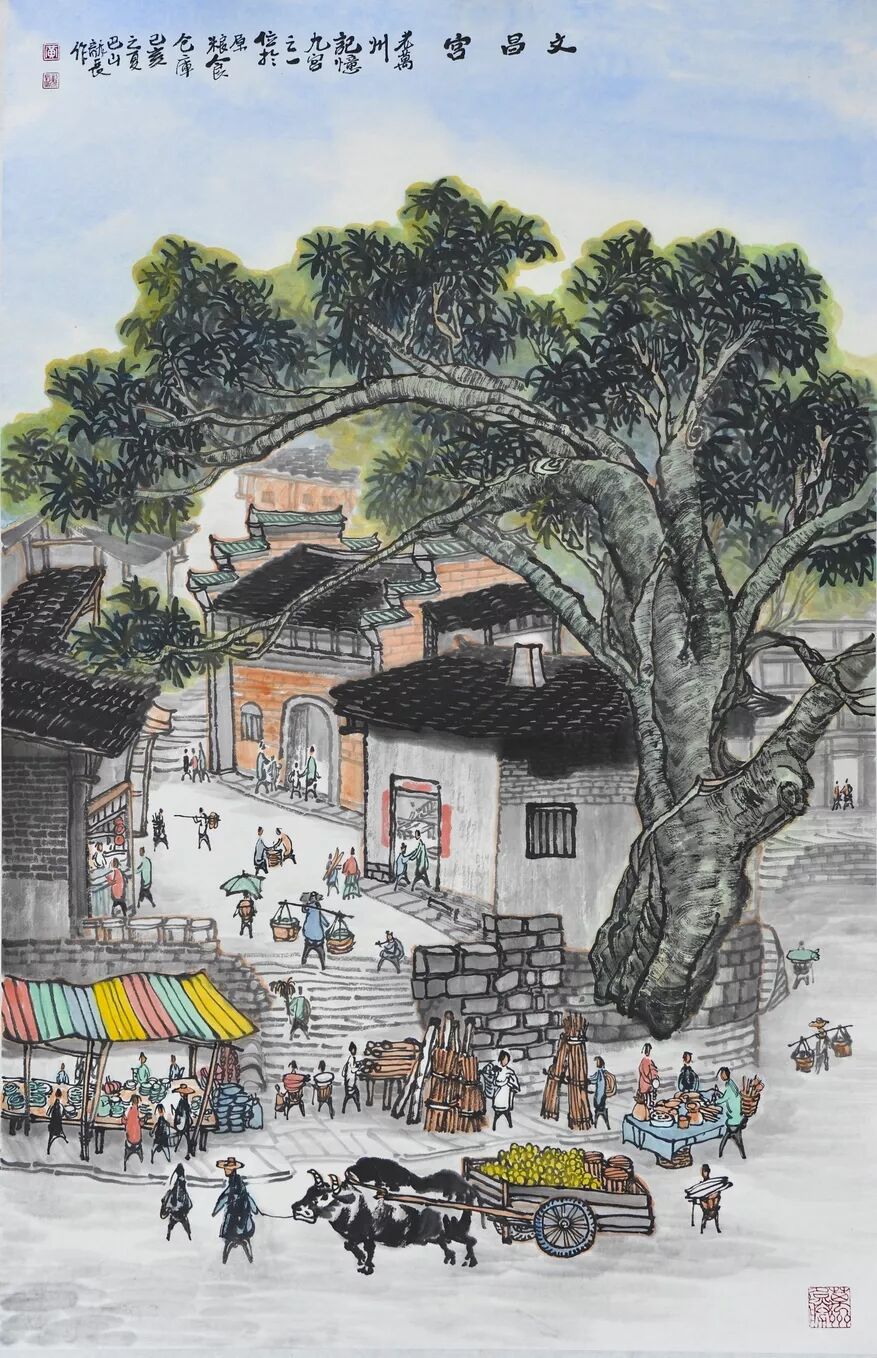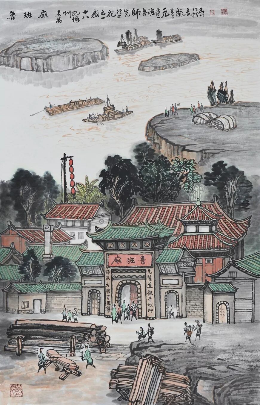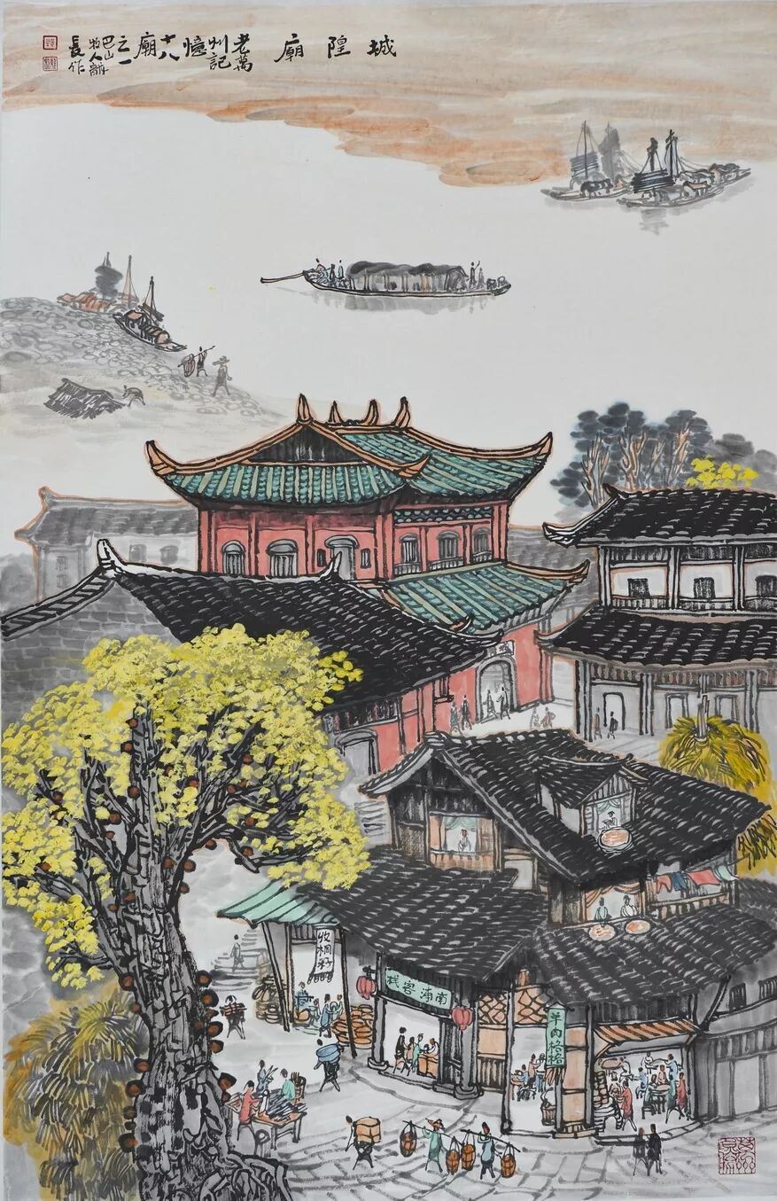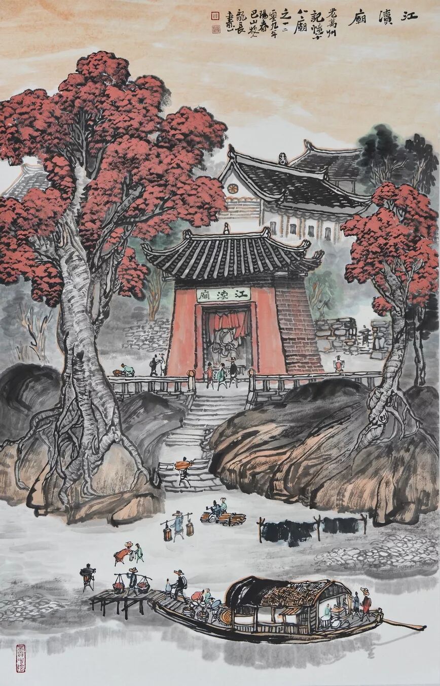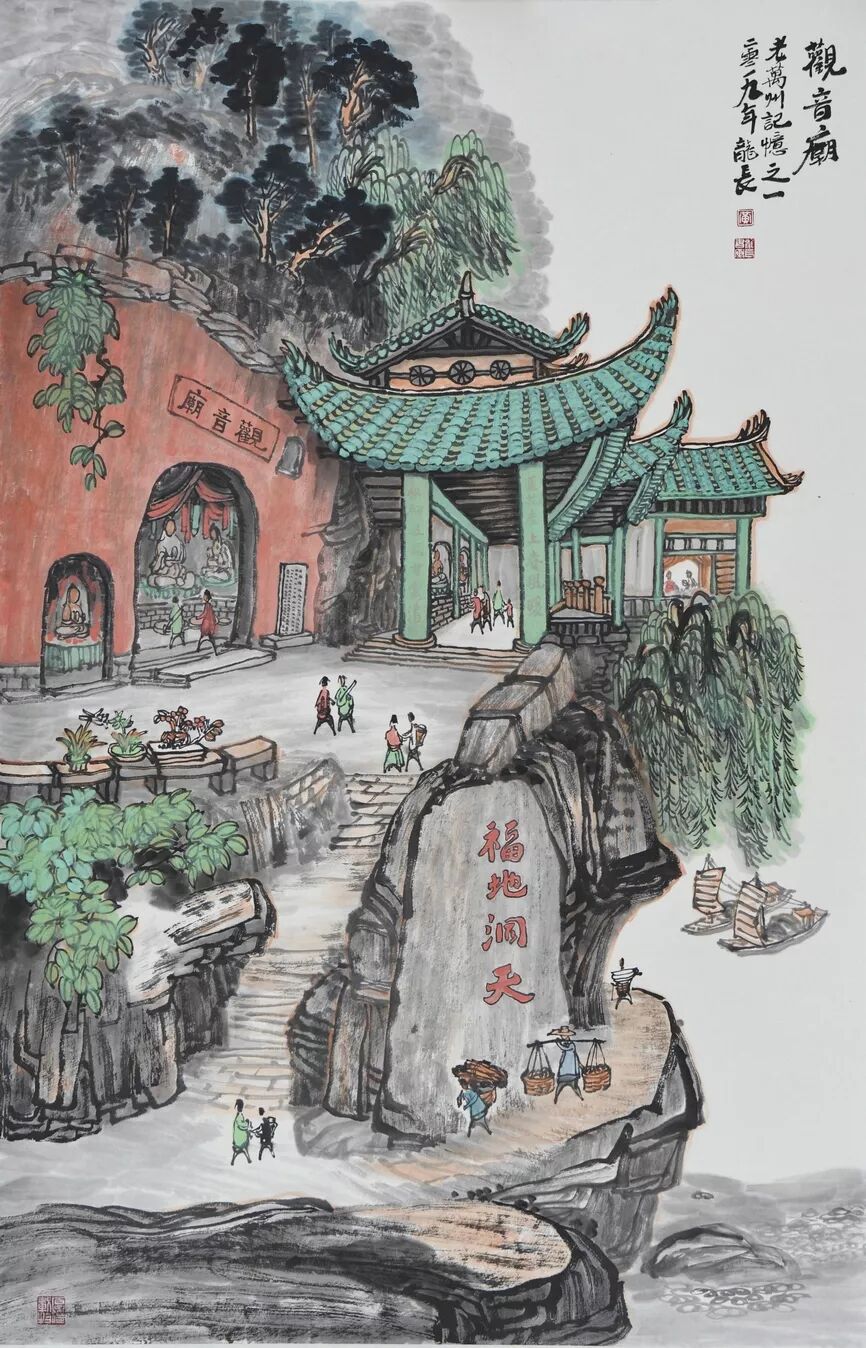 永恒的家园 《万州记忆》组画黄龙长国画作品展 主办单位:重庆市万州区文化和旅游发展委员会 承办单位:重庆三峡移民纪念 重庆市万州区文化馆 重庆市万州区美术家协会 展出内容之一:《老万州十景》系列 、《一院四寺九宫十八庙》系列 时间:2020年4月16日 至5月6日 展出内容之二:《万州码头》系列、《万州古桥》系列、《故乡记忆》系列 时间:2020年5月6日至5月26日 展出内容之三:金钱板唱段:《万州四十八景》系列 时间:2020年5月26日至6月16日 展出地点:重庆三峡移民纪念馆(鱼泉厅) 在完成脱贫攻坚任务的关键时刻,三峡之子、青年画家黄龙长,历经三年、查阅文献资料、收集图片、实际写生考察、走访万州先贤、艰辛创作完成了《万州记忆》系列国画作品。向建党一百周年献礼! 《万州记忆》以七个系列,全方位、多角度、用120幅国画作品来展示万州的历史变迁。 该组画在2018年10月被重庆市委宣传部,重庆市文联评为“优秀创作规划”。 《万州记忆》组画的创作主题是以习近平文艺座谈会讲话精神为指导,努力挖掘万州1800多年延续下来的深厚历史底蕴;以画为媒体再现三峡库区万州往日风情;以画代言述说已溶入众多万州人血液,植入万州人骨髓的乡愁;从而激励家乡人民热爱祖国、热爱家乡,奉献祖国、奉献人民的爱国情怀! 整个组画分为七大系列: 1、《老万州十景》 2、《万州四十八景》3、《一院四寺九宫十八庙》4、《万州码头》5、《万州古桥》6、 《故乡记忆》7、《故乡的黄葛树》 作者以现实主义与浪漫主义相结合的创作风格,形成了独特的民族、地域、个人的三大艺术特色,结合“浅绛”与“青绿”两派的山水画特点进行艺术创作,师法自然,又不拘泥于自然,向新时代展示出了万州古今特有的自然风光,人文历史,是一卷不可多得的具有浓郁地方特色的历史画卷,具有较高的史料价值和较为深远的教育意义。 《万州记忆》组画系列 《老万州十景》 万州历史悠久,已有1800年的历史,万州八景之说始于宋代。 1、岑洞水帘 2、金岛印浮 3、石琴响雪 4、蛾眉碛月 5、秋屏列画 6、都历摩天 7、天城倚空 8、鲁池流杯 9、西山夕照 10、白岩仙迹 岑洞水帘:此景点位于长江南岸翠屏山下一天然溶洞,洞顶有泉(名灌芝泉),夏天注水形如珠帘。隋末江陵岑道愿为避战乱隐居修道于此,距今1370多年历史。宋黄庭坚、陆游、清王世桢等均游岑公洞。洞内留存宋代以来石刻多幅,现已淹没水下。 金岛印浮: 在万州城“盘盘石”、“草盘石”两石之间的江心有一长数百米、宽数十米的巨石,夏天水涨而淹没,冬天水退而出,巨石上积沙可淘金,又名“千金石”,冬春之时,江水碧绿,在阳光的照耀下巨石金光灿灿,远看像一枚巨印,金岛印浮由此而得名。现已淹没水下。 石琴响雪:此景为万州苎溪河上一天然巨石桥,长数十米,形如平放的巨琴,横跨溪流东西两岸自然成桥,故有石琴之谓。当涨水时,桥下瀑布飞悬,溅起雪白浪花,轰鸣如雷;枯水季节,则水流叮咚有声,酷似琴音,故“石琴响雪”而得名。溪流两边是吊脚楼,河边有帆船,现已淹没水下。 蛾眉碛月:古万州南岸翠屏山、岑公洞以下沿江有一湾碛坝,冬春水落碛出,细石斑斑,形如秀眉,故称蛾眉碛月,相传古时城内男女老少每年农历正月初七成群结队渡江嬉游于此碛上,击小鼓,唱竹枝,并用鸡鸭预卜祈愿当年庄稼丰收。现已淹没水下。 秋屏列画:此景与古万州原钟鼓楼对峙,城南岸之南山,山上有翠屏寨,又称翠屏山,古时候林木繁茂,郁郁葱葱,叠翠罗列,远眺极象一幅巨大画屏,故名“翠屏”。清乾隆五十五年(1790年),洄澜塔在翠屏南山下落成,传说为镇水而建.清朝同治八年(1869年),南岸又建造了文峰塔。 都历摩天:都历山位于古万州城之北,又称北山,其山势陡峭,主峰突出老城四周众山之上,由老城举目仰望,高耸入云,有“天际孤峰一柱擎,诸恋罗列似朝尊”之感。都历山半山腰曾建有道观昭明官,又名北山观,是万州有名的北山石城。现在是从江边搬迁来的弥陀禅院。 天城倚空:位于万州苎溪河东,奇峰突起,险峻雄伟,四周绝壁如城墙,峰顶有140余亩农田,为古万州军事要塞、相传刘备曾屯兵于此,故又称“天子城”,现为国家级文物保护单位。 鲁池流杯:鲁池即高笋塘,宋至和元年(1054年),南浦(今万州)太守鲁友开凿,后世人们称作“鲁池”以示纪念。宋嘉祐八年(1063年),员外郎束庄继任南浦太守,在鲁池旁数丈见方青石上凿沟引水环注其间,即流杯池,又称“曲池”,以仿效王曦之《兰亭集序》中描绘的“曲水流觞”,是文人雅玩之地,鲁池畔原名人石刻多处,最著名的是宋代大书法家黄庭坚的《西山碑》,1839年建一古式亭阁予以保护此碑,称为“西山碑亭”,1982年被国家文管局编入全国名胜。如今鲁池已填为市民广场,流杯池、西山碑保存完好。 西山夕照:西山即太白岩,位于古万州西郊,山势陡峭、与城北都历山、天子城诸峰相对峙。自唐朝以来,就是川中名胜,被誉为“万州第一山”。 白岩仙迹:即太白岩,山势陡峭险峻,林木茂密,岩中有多处洞穴,历来有庙宇、摩崖石刻。《名胜志》记载:西山,即太白岩,去县城三里,有“绝尘龛”。相传李白曾读书于此,民间文学有“李白大醉西岩一局棋”的故事。 一院四寺九宫十八庙系列 一个地方的历史文化和民俗文化中,宗教与民祀的形态构成与史实是不可忽视的,都是丰厚的“主旨