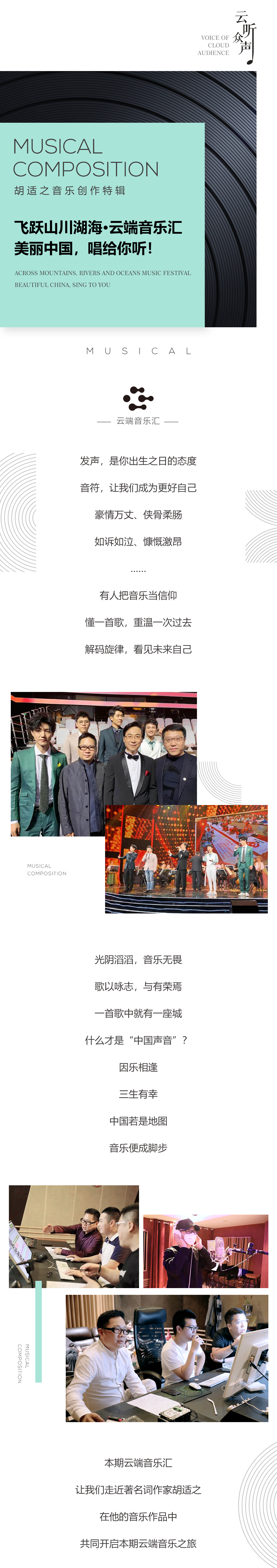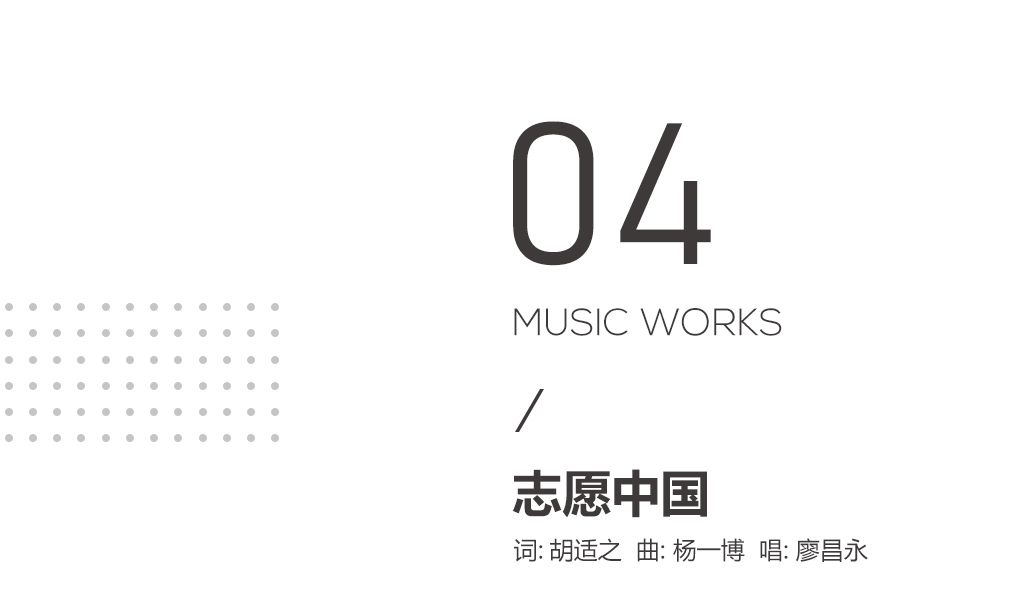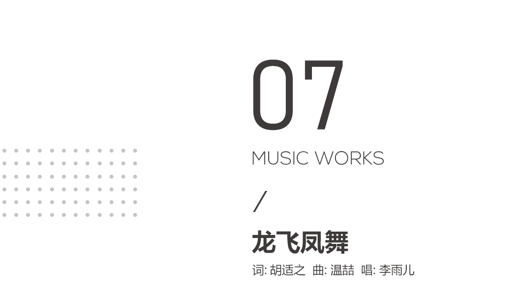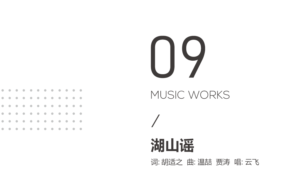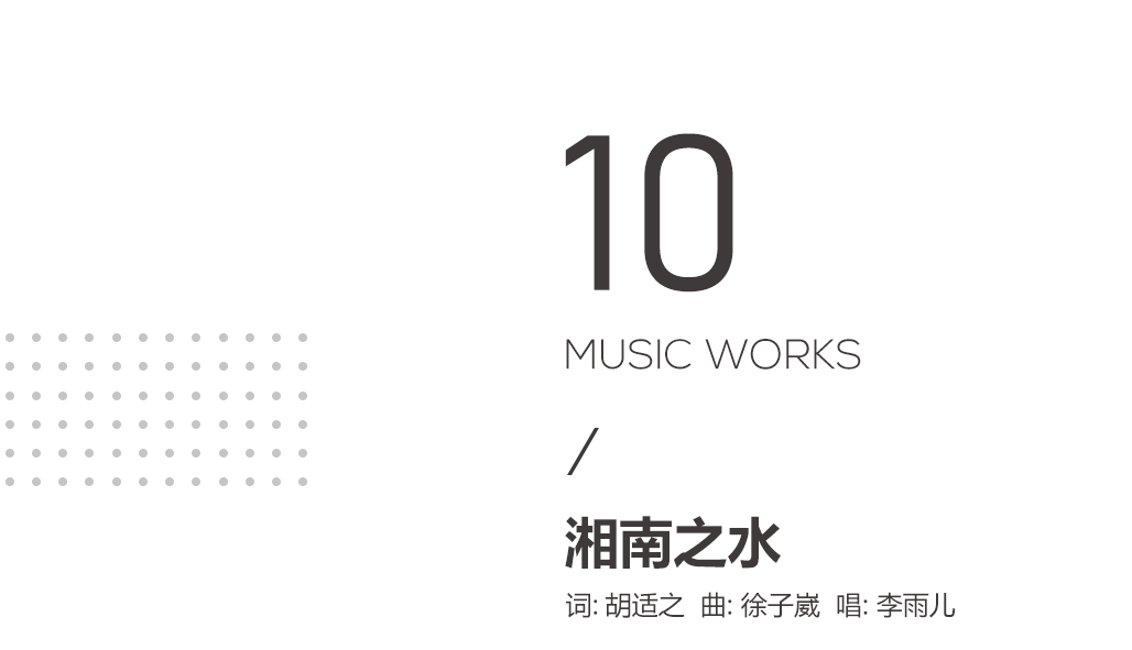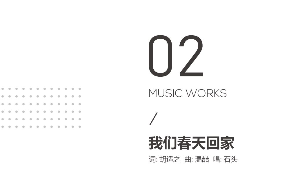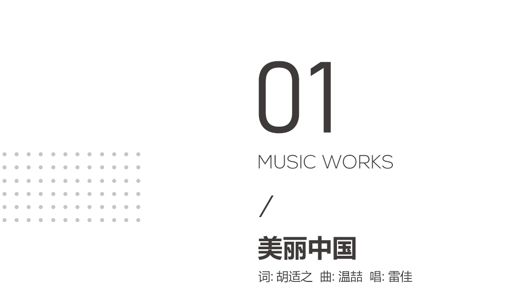 《美丽中国》由词作家胡适之作词、音乐人温喆作曲,歌唱家雷佳演唱,歌词温婉柔和、朗朗上口,曲调荡气回肠、大气磅礴,令人过耳不忘,是一首在世界范围内广为传唱的经典佳作。本歌曲创作于2015年,为“美丽中国”系列三百部微电影主题曲。歌曲一经问世,即赢得社会各界一致好评,目前其在各大音乐平台上的好评度仍在持续升温。 点击欣赏《美丽中国》MV 《我们春天回家》由词作家胡适之作词、音乐人温喆作曲、歌手石头演唱,在举国上下处于疫情防控的关键时刻,歌曲《我们春天回家》将中国一幅幅感人至深的画面、一幕幕用生命接力生命的故事通过音符温情地呈现给世界。用歌声鼓励所有面对疫情的人们,自觉凝聚起强大的民族战疫合力,早日赢得“春天”的到来。 点击欣赏《我们春天回家》 点击欣赏《我们春天回家·蒙语版》 《我们春天回家·马头琴独奏曲》由词作家胡适之作词,音乐人温喆作曲,蒙古族青年马头琴演奏家嘎拉倾情演奏。悠扬婉转的马头琴音将蒙古族群众对“战疫必胜,春天回家”的美好期盼尽情演绎,用音乐的内核力量进一步激发各族人民团结战疫。 点击欣赏《我们春天回家·马头琴独奏曲》 《我们春天回家·二胡独奏曲》由词作家胡适之作词,音乐人温喆作曲,二胡演奏家、国家一级演奏员郭民倾情演奏。细腻温婉的曲风优美如歌,国风乐器演奏的形式将听众重新带入战疫最前沿,二胡的声声牵挂亦道出人们最心地呼声和祝愿:战疫必胜,我们春天回家! 点击欣赏《我们春天回家·二胡独奏曲》 《我们春天回家·三弦独奏曲》由词作家胡适之作词,音乐人温喆作曲,三弦演奏家王学辉倾情演奏。呼声豪放、置若现场,生气盎然、直抵心灵,古老而又富有活力的三弦乐器,声声迎接逆行英雄“回家”, 每一个音符都奏得听者进入到生机勃勃,韵味十足的温情团聚场景中。 点击欣赏《我们春天回家·三弦独奏曲》 《我们春天回家·群星版》由词作家胡适之作词,音乐人温喆作曲,深圳、东莞、珠海、澳门等地艺术家联合推出,多地艺术家“合体”献唱为疫情防控再添文艺力量,群星演唱版适时发布,进一步激励战疫一线的勇士们时刻保持“战斗状态”,更加吹响“鼓劲加油”的胜利号角。 点击欣赏《我们春天回家·群星版》 《我们春天回家·英文版》(《Come home in springtime》)由词作家胡适之作词,音乐人温喆作曲,加拿大华人歌手李禅玉改编,温暖的歌词和动人的旋律,已超越地域限制,不仅触动着思乡的游子,唱出了海外华人华侨的心声,也为世界各国正处于疫情防控中的人们送去温暖,激励大家齐心协力,早日战胜疫情,平安回到家乡! 《十月一日》由词作家胡适之作词,青年作曲家杨一博作曲,青年歌唱家王凯演唱。歌曲为庆祝中华人民共和国成立70周年国庆献礼作品,曲调喜庆欢快、气势恢宏,融合了歌剧、民族元素、流行唱法等丰富的艺术表现形式,极具穿透力的旋律,充满浓郁的爱国情怀。 点击欣赏《十月一日》 《志愿中国》由中共中央文明办、中国文联、中央广播电视总台等单位委约词作家胡适之作词、青年作曲家杨一博作曲,歌唱家廖昌永演唱,由中共中央宣传部在2018年3月5日通过中央广播电视总台向全国发布,一经推出便广受好评,并收录在“中国文联成立70周年原创音乐作品选集”中,已作为全国学雷锋志愿服务主题歌曲供全国各地各部门使用传唱。 点击欣赏《志愿中国》 《仰望》由词作家胡适之作词、音乐人温喆作曲,歌手石头演唱。这是一首有关“梦想”与“力量”的歌,通过艺术形式的回忆和诉说,激励每一位逐梦路上的奋进者要有爱的担当,从而达到“这一路,初心不忘”的境界和高度。歌曲被中央广播电视总台以多种艺术形式在各大栏目播放,被网友誉为新时代励志歌曲经典之作。 点击欣赏《仰望》 《一江春水》由词作家胡适之作词、曲作家戴慧明作曲、青年歌唱家周晰丽演唱。歌词如诗如画,将冷水江宜居的生态诗意呈现,“与你相守,一江春水”唱出外界对冷水江美好生活向往的真实写照。这首歌为微电影《一江春水》同名主题曲,曾在美国迈阿密国际微电影节上全球唱响。 点击欣赏《一江春水》 《龙飞凤舞》由词作家胡适之作词,音乐人温喆作曲,音乐人李珂编曲,歌坛唱将李雨儿演唱。为微电影《龙飞凤舞》同名主题曲,词中“行一条大路通天,寻一条飞龙下凡”描述的是临武县“龙源”及“通天玉”的文化典故。喜庆祥和地旋律将临武县近年飞速发展的城市实践,如实搬进艺术作品之中。 点击欣赏《龙飞凤舞》 《康养石柱》由词作家胡适之作词、作曲家杨一博作曲,金钟奖金奖得主、青年歌唱家龚爽演唱,歌曲融入了土家族民俗与音乐元素,欢快的节奏一气呵成,这片热土滋养出的土家儿女的热情与浪漫也饱含在歌声里。 点击欣赏《康养石柱》 《湖山谣》由词作家胡适之作词,音乐人温喆、贾涛作曲,李珂编曲、歌手云飞演唱。为微电影《湖山谣》同名主题曲。“一曲湖山谣,你可曾听见”将半城湖水半城山汉丰烟雨如画般呈现,润柔悠远的演唱,描绘出汉丰湖发展的美好脉动,一曲湖山谣,唤我回故乡。 点击欣赏《湖山谣》 《湘南之水》由词作家胡适之作词、音乐人徐子崴作曲、歌手李雨儿演唱。微电影《雾漫小东江》主题曲,妙蔓歌声中再现一幅湘南渔火的乡愁画卷,柔情似水中道的