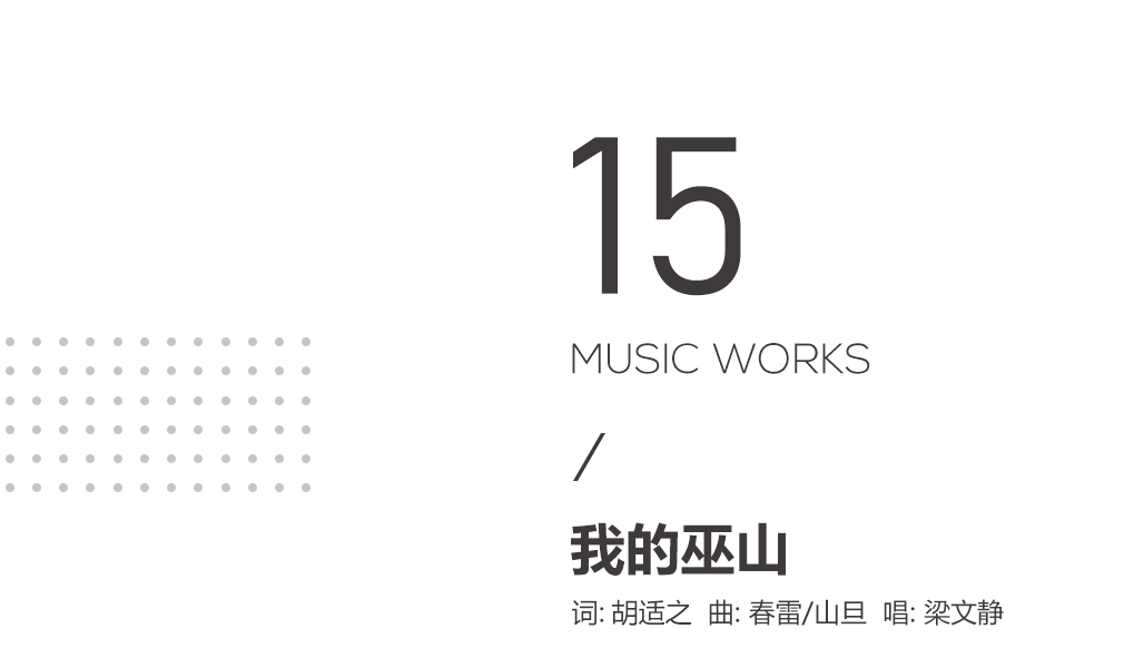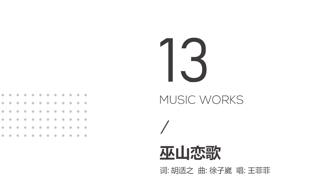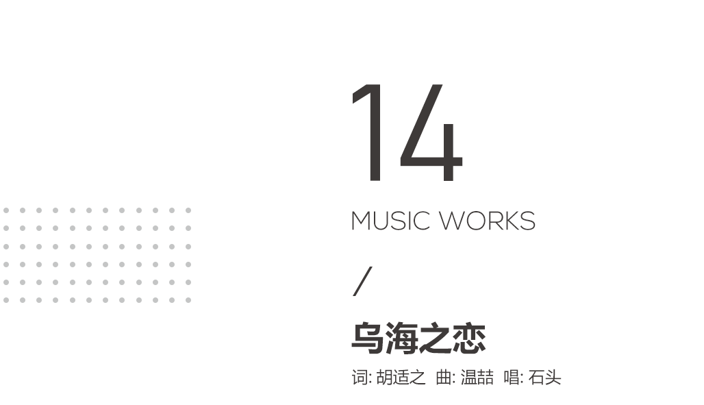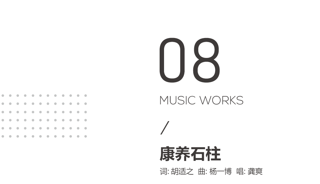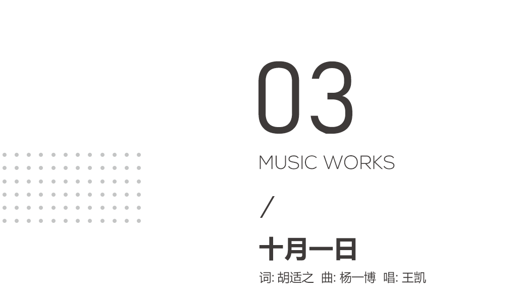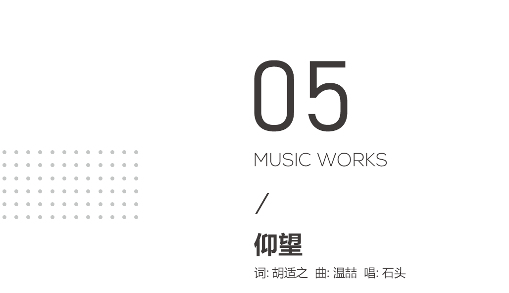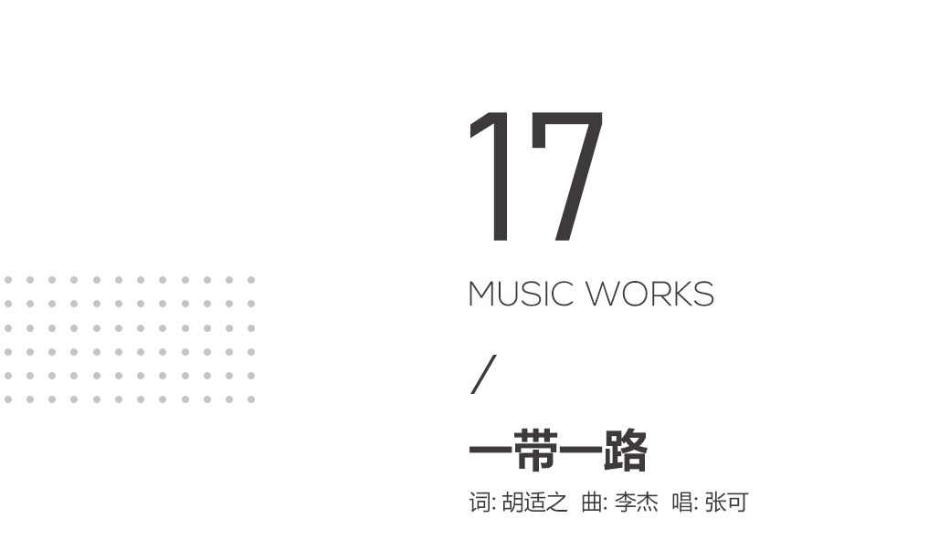 《美丽中国》由词作家胡适之作词、音乐人温喆作曲,歌唱家雷佳演唱,歌词温婉柔和、朗朗上口,曲调荡气回肠、大气磅礴,令人过耳不忘,是一首在世界范围内广为传唱的经典佳作。本歌曲创作于2015年,为“美丽中国”系列三百部微电影主题曲。歌曲一经问世,即赢得社会各界一致好评,目前其在各大音乐平台上的好评度仍在持续升温。 点击欣赏《美丽中国》MV 《我们春天回家》由词作家胡适之作词、音乐人温喆作曲、歌手石头演唱,在举国上下处于疫情防控的关键时刻,歌曲《我们春天回家》将中国一幅幅感人至深的画面、一幕幕用生命接力生命的故事通过音符温情地呈现给世界。用歌声鼓励所有面对疫情的人们,自觉凝聚起强大的民族战疫合力,早日赢得“春天”的到来。 点击欣赏《我们春天回家》 点击欣赏《我们春天回家·蒙语版》 《我们春天回家·马头琴独奏曲》由词作家胡适之作词,音乐人温喆作曲,蒙古族青年马头琴演奏家嘎拉倾情演奏。悠扬婉转的马头琴音将蒙古族群众对“战疫必胜,春天回家”的美好期盼尽情演绎,用音乐的内核力量进一步激发各族人民团结战疫。 点击欣赏《我们春天回家·马头琴独奏曲》 《我们春天回家·二胡独奏曲》由词作家胡适之作词,音乐人温喆作曲,二胡演奏家、国家一级演奏员郭民倾情演奏。细腻温婉的曲风优美如歌,国风乐器演奏的形式将听众重新带入战疫最前沿,二胡的声声牵挂亦道出人们最心地呼声和祝愿:战疫必胜,我们春天回家! 点击欣赏《我们春天回家·二胡独奏曲》 《我们春天回家·三弦独奏曲》由词作家胡适之作词,音乐人温喆作曲,三弦演奏家王学辉倾情演奏。呼声豪放、置若现场,生气盎然、直抵心灵,古老而又富有活力的三弦乐器,声声迎接逆行英雄“回家”, 每一个音符都奏得听者进入到生机勃勃,韵味十足的温情团聚场景中。 点击欣赏《我们春天回家·三弦独奏曲》 《我们春天回家·群星版》由词作家胡适之作词,音乐人温喆作曲,深圳、东莞、珠海、澳门等地艺术家联合推出,多地艺术家“合体”献唱为疫情防控再添文艺力量,群星演唱版适时发布,进一步激励战疫一线的勇士们时刻保持“战斗状态”,更加吹响“鼓劲加油”的胜利号角。 点击欣赏《我们春天回家·群星版》 《我们春天回家·英文版》(《Come home in springtime》)由词作家胡适之作词,音乐人温喆作曲,加拿大华人歌手李禅玉改编,温暖的歌词和动人的旋律,已超越地域限制,不仅触动着思乡的游子,唱出了海外华人华侨的心声,也为世界各国正处于疫情防控中的人们送去温暖,激励大家齐心协力,早日战胜疫情,平安回到家乡! 《十月一日》由词作家胡适之作词,青年作曲家杨一博作曲,青年歌唱家王凯演唱。歌曲为庆祝中华人民共和国成立70周年国庆献礼作品,曲调喜庆欢快、气势恢宏,融合了歌剧、民族元素、流行唱法等丰富的艺术表现形式,极具穿透力的旋律,充满浓郁的爱国情怀。 点击欣赏《十月一日》 《志愿中国》由中共中央文明办、中国文联、中央广播电视总台等单位委约词作家胡适之作词、青年作曲家杨一博作曲,歌唱家廖昌永演唱,由中共中央宣传部在2018年3月5日通过中央广播电视总台向全国发布,一经推出便广受好评,并收录在“中国文联成立70周年原创音乐作品选集”中,已作为全国学雷锋志愿服务主题歌曲供全国各地各部门使用传唱。 点击欣赏《志愿中国》 《仰望》由词作家胡适之作词、音乐人温喆作曲,歌手石头演唱。这是一首有关“梦想”与“力量”的歌,通过艺术形式的回忆和诉说,激励每一位逐梦路上的奋进者要有爱的担当,从而达到“这一路,初心不忘”的境界和高度。歌曲被中央广播电视总台以多种艺术形式在各大栏目播放,被网友誉为新时代励志歌曲经典之作。 点击欣赏《仰望》 《一江春水》由词作家胡适之作词、曲作家戴慧明作曲、青年歌唱家周晰丽演唱。歌词如诗如画,将冷水江宜居的生态诗意呈现,“与你相守,一江春水”唱出外界对冷水江美好生活向往的真实写照。这首歌为微电影《一江春水》同名主题曲,曾在美国迈阿密国际微电影节上全球唱响。 点击欣赏《一江春水》 《龙飞凤舞》由词作家胡适之作词,音乐人温喆作曲,音乐人李珂编曲,歌坛唱将李雨儿演唱。为微电影《龙飞凤舞》同名主题曲,词中“行一条大路通天,寻一条飞龙下凡”描述的是临武县“龙源”及“通天玉”的文化典故。喜庆祥和地旋律将临武县近年飞速发展的城市实践,如实搬进艺术作品之中。 点击欣赏《龙飞凤舞》 《康养石柱》由词作家胡适之作词、作曲家杨一博作曲,金钟奖金奖得主、青年歌唱家龚爽演唱,歌曲融入了土家族民俗与音乐元素,欢快的节奏一气呵成,这片热土滋养出的土家儿女的热情与浪漫也饱含在歌声里。 点击欣赏《康养石柱》 《湖山谣》由词作家胡适之作词,音乐人温喆、贾涛作曲,李珂编曲、歌手云飞演唱。为微电影《湖山谣》同名主题曲。“一曲湖山谣,你可曾听见”将半城湖水半城山汉丰烟雨如画般呈现,润柔悠远的演唱,描绘出汉丰湖发展的美好脉动,一曲湖山谣,唤我回故乡。 点击欣赏《湖山谣》 《湘南之水》由词作家胡适之作词、音乐人徐子崴作曲、歌手李雨儿演唱。微电影《雾漫小东江》主题曲,妙蔓歌声中再现一幅湘南渔火的乡愁画卷,柔情似水中道的