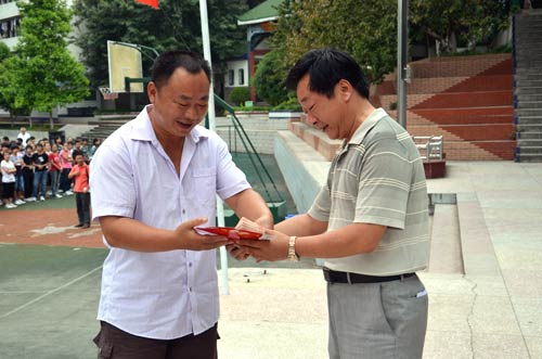云阳双江中学李诚同学的父亲从三峡之子联合会副会长王茂手中接过了荣誉证书及奖金