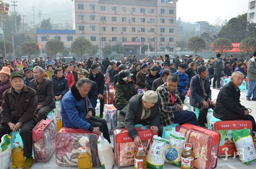1月27日上午,平常空旷的广场上热闹非凡,三峡之子、重庆市万州区明邦建材有限公司董事长王淑军,带上6万余元厚礼,回到家乡云阳养鹿镇,为全镇160户贫困家庭送上年货和红包,让他们都过上一个愉快祥和的春节。