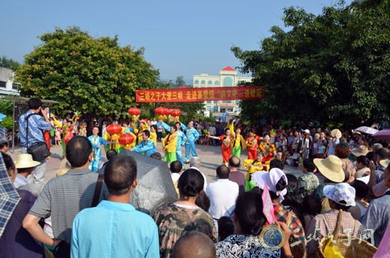 当日上午9时许,演出活动在政府大楼门前院坝拉开帷幕,此时已是艳阳高照,火辣的太阳灼热大地,不少村民躲进院坝葱绿的黄角树下观看演出,文艺演出团队的演员们顶着烈日,穿着五彩的演出服装,为高粱镇村民倾情奉献文艺大餐。