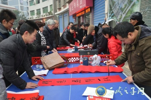 (三峡都市报 记者 郭虎)刘春梅喜滋滋地从人群中挤出来,她拿到了一副刚写好的春联,联上写着“春风化雨千家乐;政策归心万户欢”。