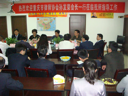 昨日下午,十七大党代表、重庆市政协常委、重庆市律师协会会长孙发荣,莅临重庆锦扬律师事务所参观并听取三峡之子、锦扬律师事务所主任段茂兵的情况汇报。该所实施的“村村有律师“工程、律师参与人大接访工作、城乡支部结对共建活动等分别开创全国、全市、全区之先河,“三项首创”获得孙发荣一行的高度赞扬,并表示好的经验将在律协进行推广。
