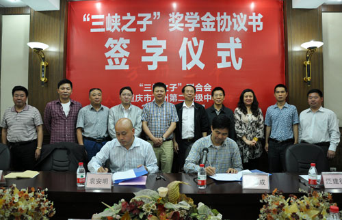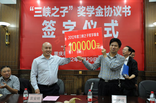 昨日,“三峡之子”奖学金协议书,在重庆市万州第二高级中学正式签署。该协议的签署表明:“三峡之子奖学金”在万州正式诞生。签字仪式现场,会长袁安明代表三峡之子联合会将2012年度的10万元“三峡之子奖学金”郑重地交付到万州二中校长汪建德的手中,并承诺每年捐赠10万元。