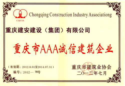 此次评审按照”重庆市AAA诚信建筑企业行业评价认证办法”由重庆市建筑业协会组织行业专家对申报企业的基本素质、经营能力及财务、管理、竞争力、信用记录等指标逐项进行评价和审核,并经重庆市AAA诚信建筑企业行业评价认证委员会进行严格认证和公示。重庆建安建设(集团)有限公司等87家建筑企业被授予“2012年重庆市AAA诚信建筑企业”荣誉称号。