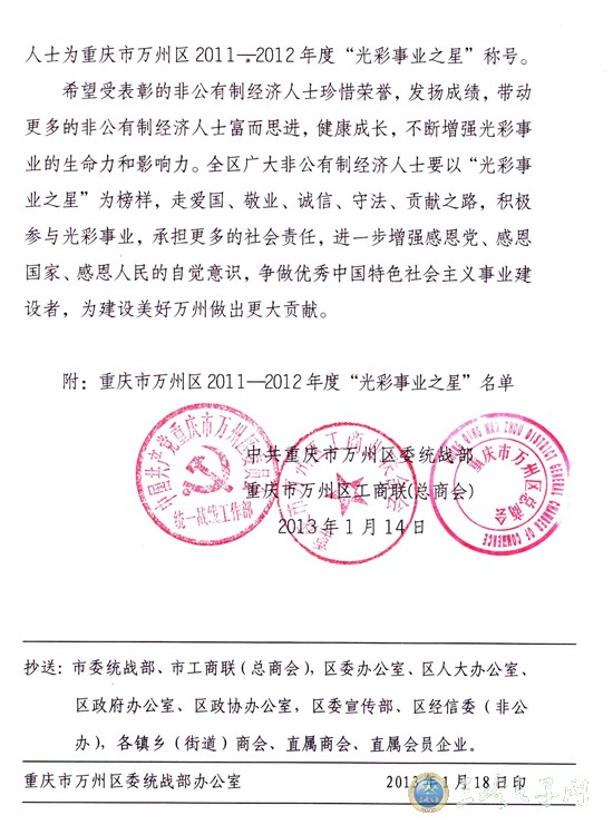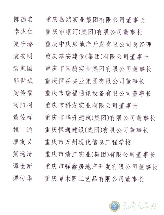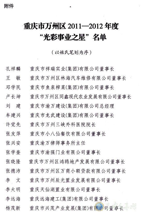 1月18日,在万州区工商联四届三次执委会上,三峡之子袁安明、王敏、牟建兴、张德沛、陶传福、廖友义、谭传华、邓学明、幸杰仁、郭世斌荣获万州区第一届“光彩事业之星”。