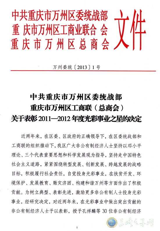 >联合会动态1月18日,在万州区工商联四届三次执委会上,三峡之子袁安明、王敏、牟建兴、张德沛、陶传福、廖友义、谭传华、邓学明、幸杰仁、郭世斌荣获万州区第一届“光彩事业之星”。
