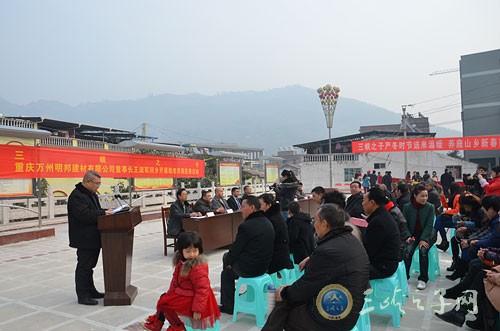 1月27日上午,平常空旷的广场上热闹非凡,三峡之子、重庆市万州区明邦建材有限公司董事长王淑军,带上6万余元厚礼,回到家乡云阳养鹿镇,为全镇160户贫困家庭送上年货和红包,让他们都过上一个愉快祥和的春节。
