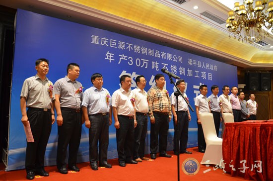 梁平县委书记蒋宜茂在签约仪式上致辞,他说,年产30万吨不锈钢加工项目是梁平县今年招商的"一号项目",是迄今为止落实梁平投资最大的工业项目,是双方互惠互利,互相信任的结果。该项目有广阔的市场前景,建成后,不仅对巨源公司的长远发展具有重要战略意义,还将有力推动梁平县经济结构的调整和产业的提升,填补重庆乃至西南地区大型不锈钢加工业的空白。