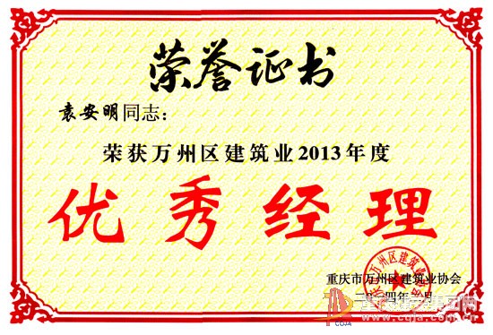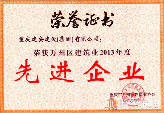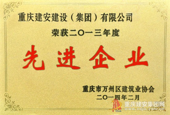 据万州区建筑业协会消息,2013年我区建筑行业为万州区的城市建设和经济建设做出了较大贡献,创历史最好成绩。为表彰先进,按照万州区城乡建设委员会的通知精神,经区建筑业协会评审:重庆建安建设(集团)有限公司等38家企业被授予“2013年度万州区先进企业”称号;集团公司董事长袁安明荣获“2013年度万州区建筑业优秀经理”称号。