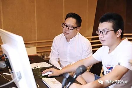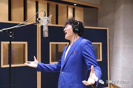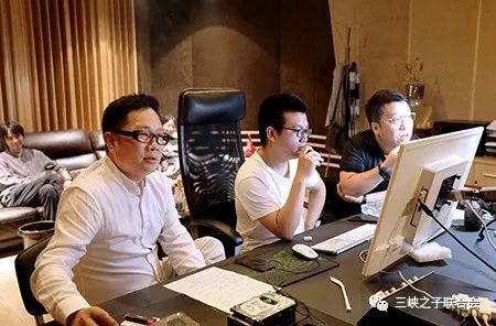 图片说明:著名词作家胡适之(左)、青年作曲家杨一博(右)、新锐跨界青年歌唱家王凯(中),在歌曲《十月一日》录制现场