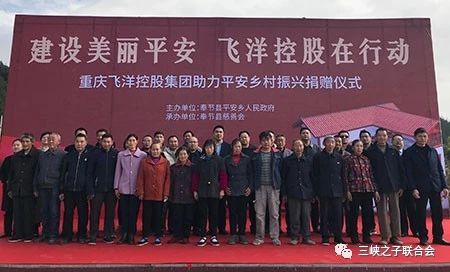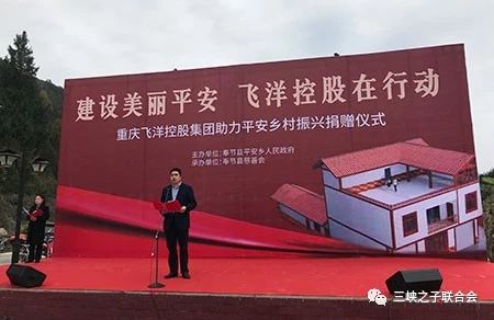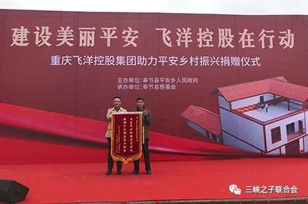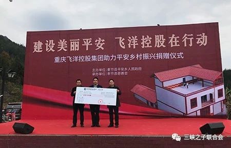 2019年11月15日,由奉节县平安乡人民政府主办的“建设美丽平安 飞洋控股在行动,重庆飞洋控股集团助力平安乡村振兴捐赠仪式”,在重庆市奉节县平安乡向子村村委会广场举行。奉节县住房城乡建设委员会赵继忠副主任,奉节县慈善会杨发顺会长,三峡之子联合会副会长、飞洋控股董事长杨必全等代表出席本次捐赠仪式。