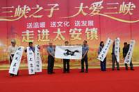 >>2012年7月13日上午,万州区太安镇凤凰茶乡气球高扬,音乐嘹亮,一派欢天喜地气氛。三峡都市报社、三峡之子联合会携手载着“文化、温暖、发展”三件礼物来到太安,为太安镇乡亲们送来了一台精彩的文艺演出,为10名贫困老党员送去了慰问品和慰问金。聚集在这里的太安镇干部们更是兴奋,三峡之子为凤凰茶乡的发展带来了希望与项目,他们将携手与太安共谋发展。