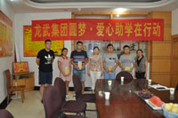 >>8月28日,在新学年到来之际,联合会副会长牟建兴举行的“龙武集团圆梦,爱心助学在行动”捐赠仪式在龙武集团公司会议室进行。新考入大学的贫困新生牟为、熊渝檬、黄荣琪及前受助在读的七名贫困学子受到资助,每人领取了由龙武集团资助的5000元现金。为这些贫困学子跨入大学门槛解燃眉之急。受助学子纷纷表示,进入大学后一定努力学习,成为有用之才,以感恩企业,回报社会。近10年来,每年的新学年伊始,三峡之子牟建兴的龙武公司都会有一次这样的捐资助学场景。