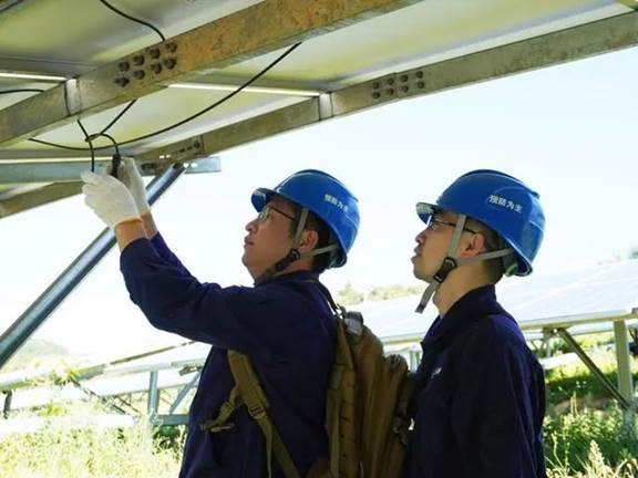 站在两坪乡向鸭村山顶远眺,披满绿色植被的小山坡上,整齐排列的太阳能光伏发电板,在阳光照射下闪闪发光,犹如一片颇为壮观的“蓝色海洋”,它们正将太阳能源源不断地转化为电能,输送到千家万户。工作人员正行走在光伏发电板间,检查光伏发电设备的温度、电压、电流功率等参数,确保光伏发电系统安全、高效运行,以及绿色能源的高效利用。